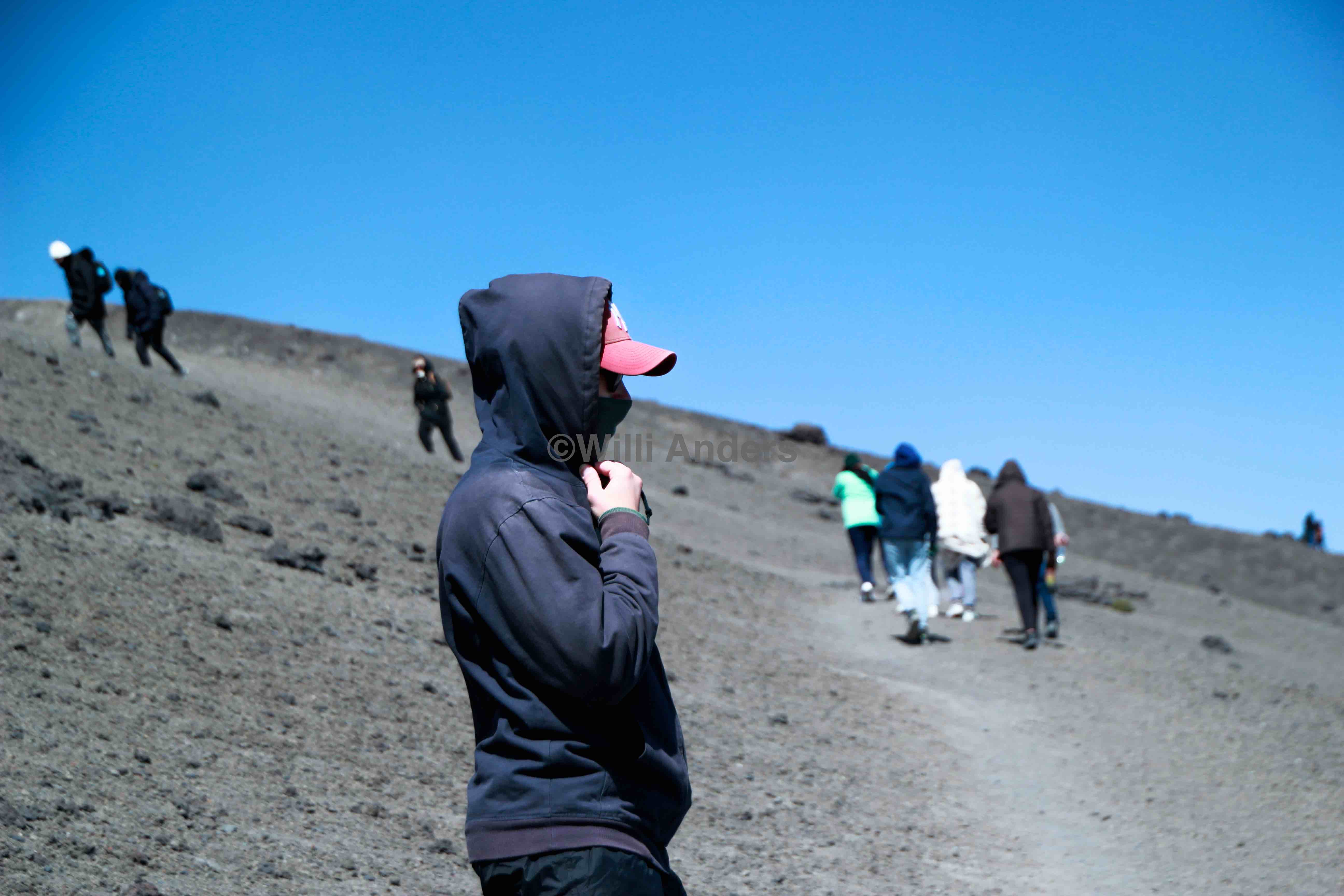 Tja tatsächlich war allerdings auch DIESER Ausflug nicht das Highlight unserer Woche! Denn: am Tag darauf waren wir als Teil einer Ausflugsgruppe den ganzen Tag unterwegs und zwar zum Cotopaxi sowie zum Quilotoa. Unsere Ausflugsgruppe war nämlich eine Gruppe Englischlernender, deren Institut eine Art Kooperation mit unser Organisation hat. Wir als Freiwillige dürfen dort deutlich vergünstigt (in unserem Fall für $20) mit auf den Ausflug, im Gegenzug haben die Lernenden dort die Gelegenheit, mit Ausländern und (hoffentlich) guten Englischsprechern in Unterhaltung zu treten. Das war natürlich irgendwie eine Art Jackpot für uns. Um 05:00 Uhr morgens ging es los und wir sind im Bus mit gefühlt Tempo 150 aus Quito raus in Richtung Cotopaxi geheizt. Zwischendrin gab es Frühstück und naja, irgendwann waren wir dann am Fuß des Berges. Wobei der Cotopaxi eigentlich ein Vulkan ist, wie gefühlt alles in den Anden hier. Jedenfalls: es war eine spektakuläre Fahrt durch den dortigen Nationalpark, auch wenn ich zeitweise ein wenig das Vertrauen in unseren Bus verloren habe. Der hat nämlich ordentlich geschwankt (SEEEEEEHR ordentlich), je näher wir am Cotopaxi waren. Das mag allerdings auch an der dortigen Straße gelegen haben, welche nämlich nicht existent sondern an deren Stelle eine Art Kiespfad vorhanden war. Aber auch die gefühlten 120% Steigung, an denen unser Bus teilweise anfahren musste, haben schon für gut Zittern bei allen Fahrgästen gesorgt. Ne Achterbahn brauche ich jetzt erstmal nicht mehr besuchen. Letztendlich sind wir ja aber sicher angekommen und wurden auf den 4.700 Höhenmetern, auf denen wir ausgestiegen sind, erstmal von Windgeschwindigkeiten über 25 km/h und dem Sandsturm der Hölle begrüßt. Nicht so ganz einfach ist sie deshalb gewesen, unsere 1-stündige Wanderung aber Spaß gemacht hat sie allemal. Und wow war ich froh über meinen Rollkragenpullover, dessen Kragen ich nämlich ausklappen und als Gesichtschutz verwenden konnte!