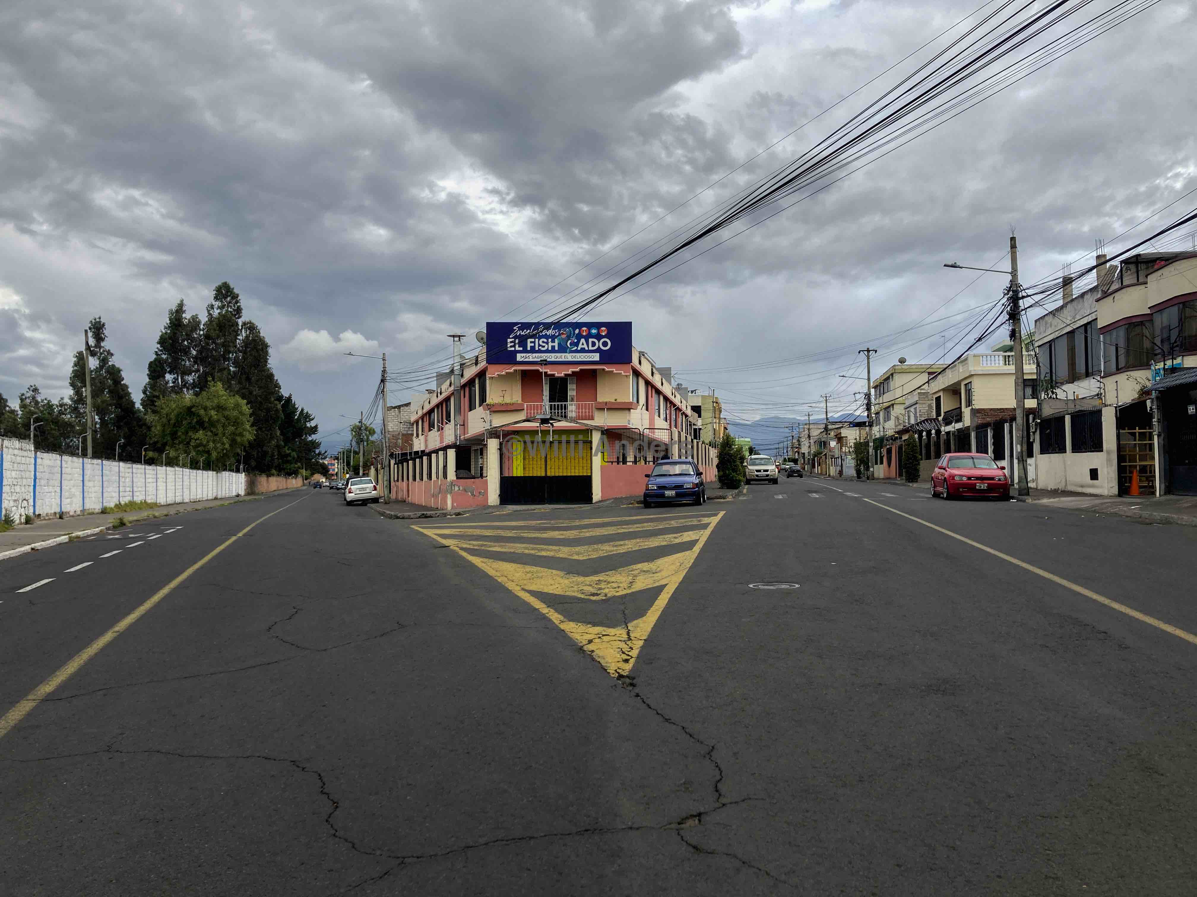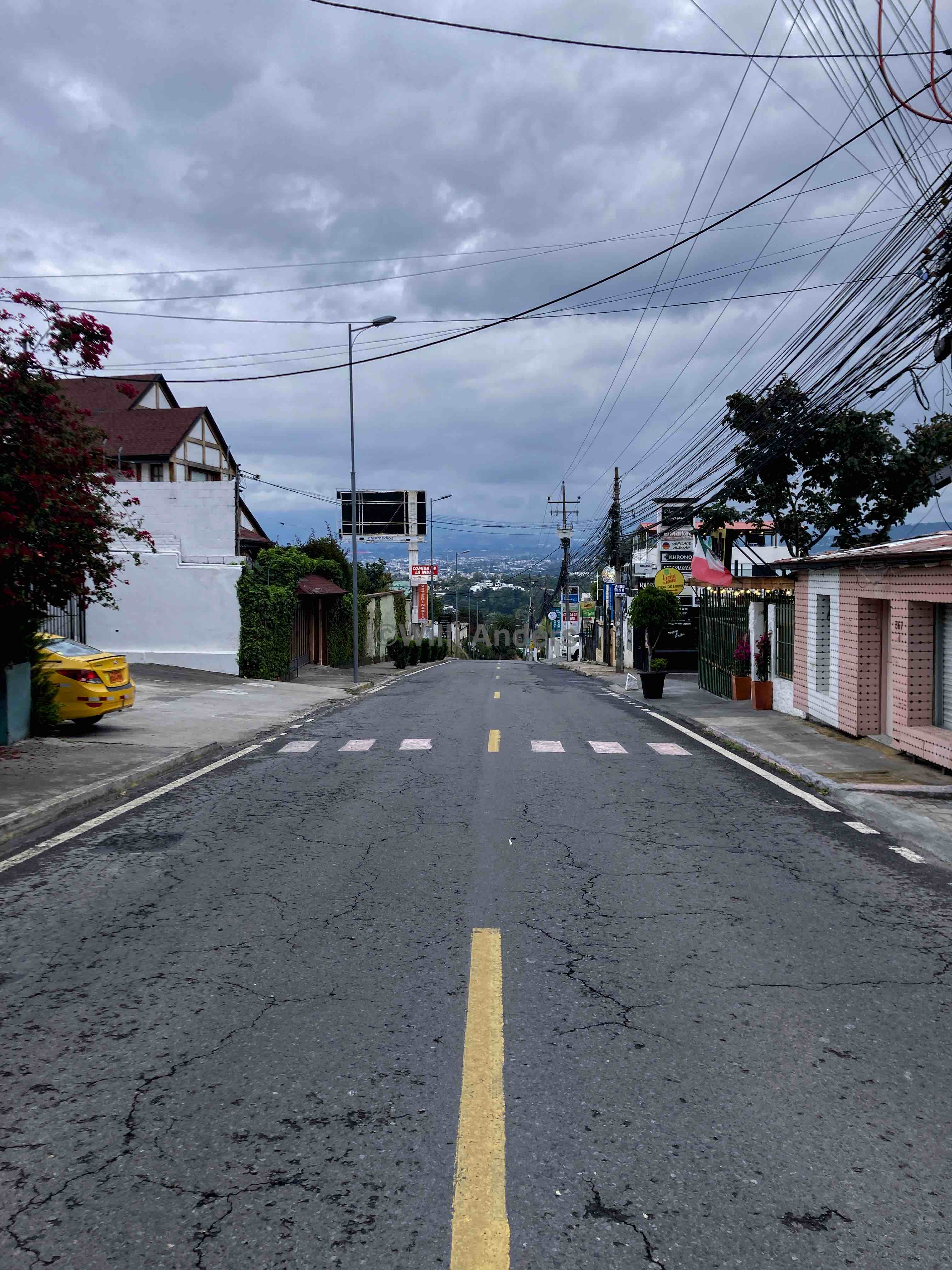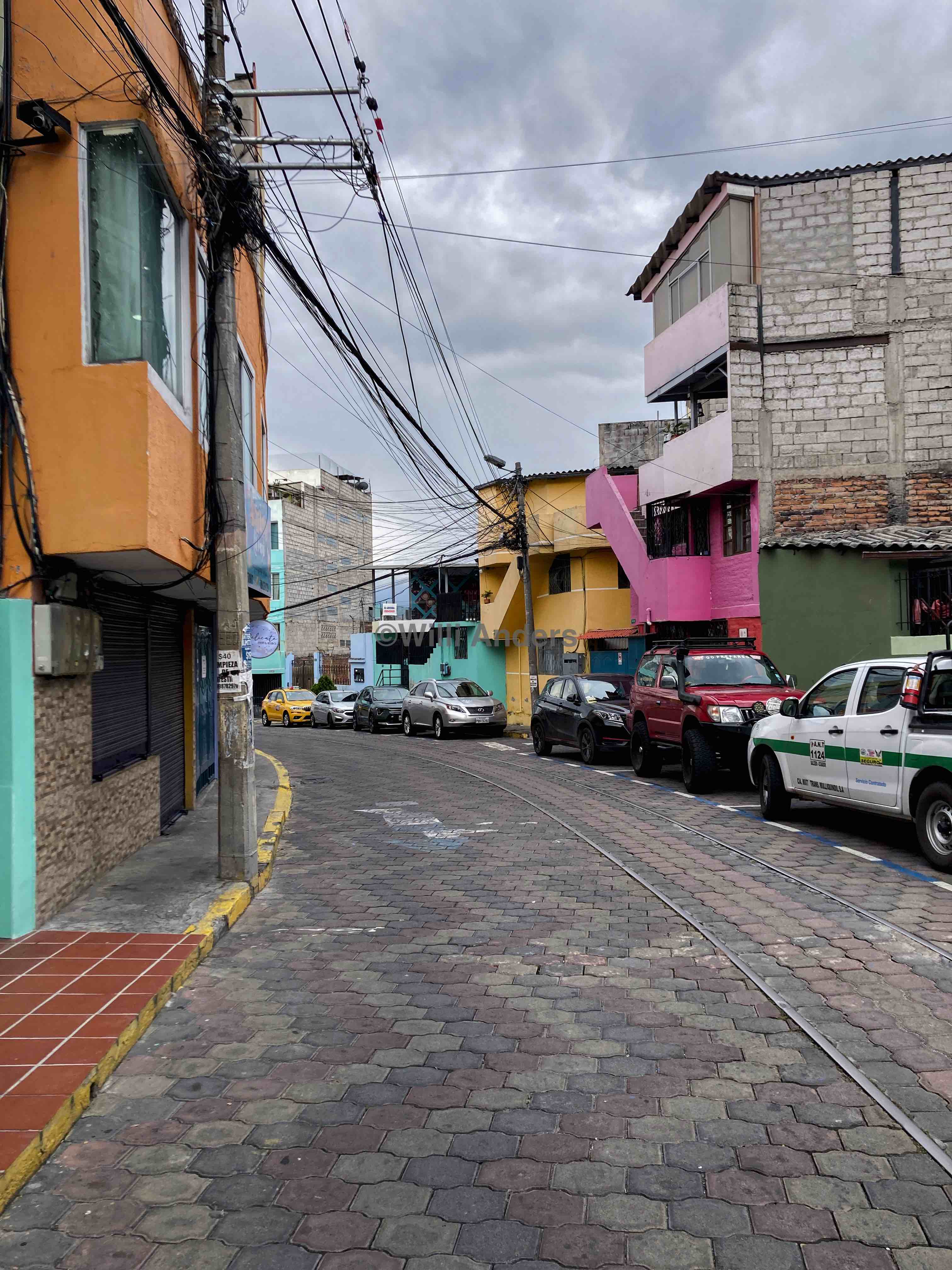 Ansonsten kann ich im Prinzip nur sagen: die Leute hier sind nett, das Essen lecker und die Gegend lustig und sympathisch. Wir sind in einem Viertel, das stereotypischer kaum sein könnte: Strommasten überall, Straßenhunde und entsprechend Ausscheidungen auf den Wegen ohne Ende, alte, zerbeulte aber trotzdem getunte Autos an jeder Ecke und die obligatorische bunte katholische Kirche gibt es auch. Von meinem deutschen Lebensstandard aus würde ich sagen, dass es hier einigermaßen heruntergekommen ist, in Quito. Aber erstens kann ich ja gar nicht in die Häuser in diesem Viertel hineinblicken sondern sehe nur das Äußere und zweitens ist nichts von dem, was ich hier entdecke in irgendeiner Form repräsentativ für Quito, Ecuador oder Südamerika.
