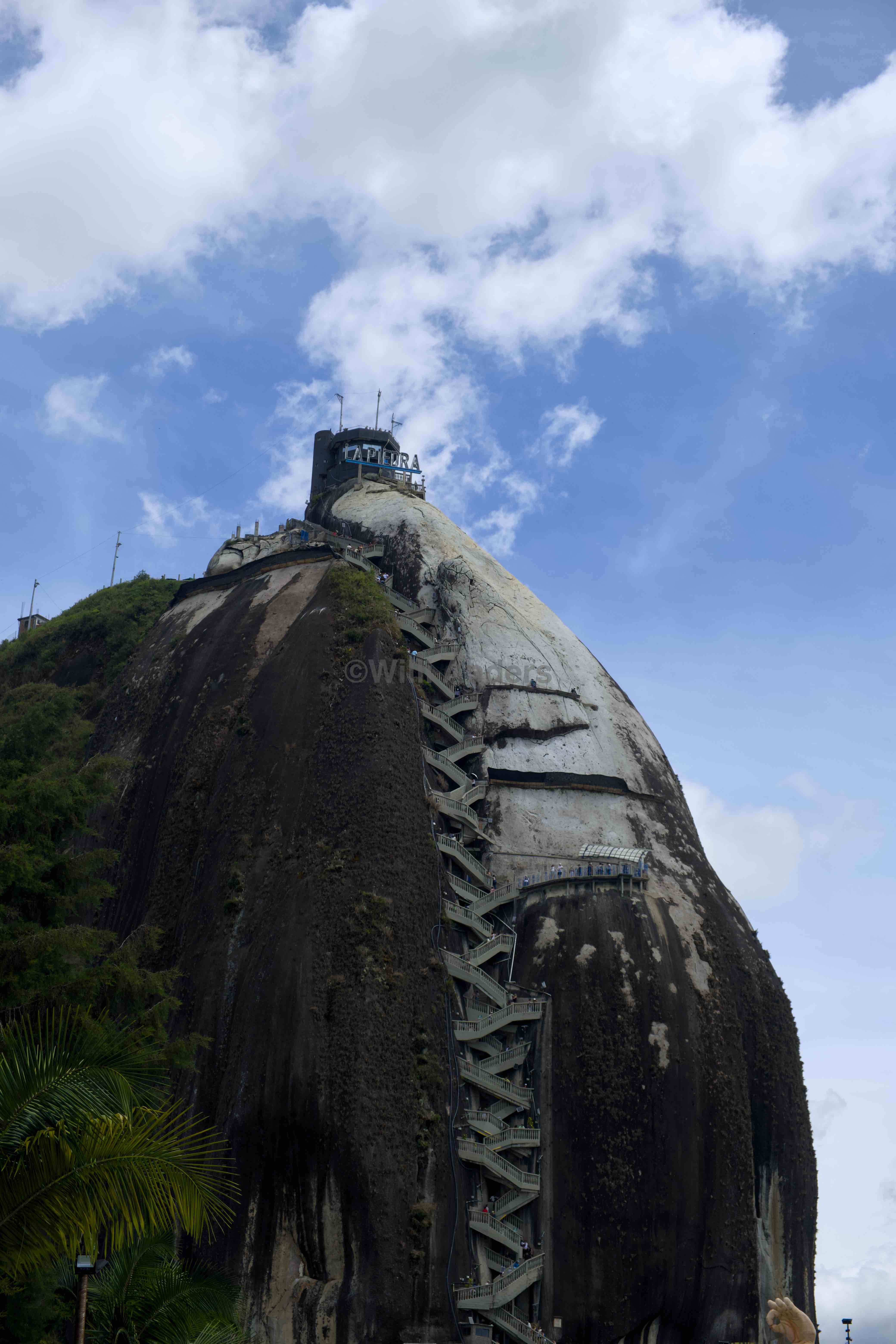 Nach unserer Stadttour ging es dann jedenfalls zur "Piedra del Peñol" bzw. dem "Peñon de Guatapé". Bei dem Namen streiten sich die beiden benachbarten Gemeinden Peñol und Guatapé bis heute, aber worum es geht bleibt ja gleich: ein großer Stein. Ein ziemlich großer Stein sogar, eher ein Fels, vielleicht gar ein Berg. Dieses 2.135 Meter hohe kolumbianische Nationalmonument aus Granit befindet sich jedenfalls am Rande der Stauseen zwischen Peñol und Guatapé und ist eine absolute Touristenattraktion. Und das auch zurecht, wie ich finde.