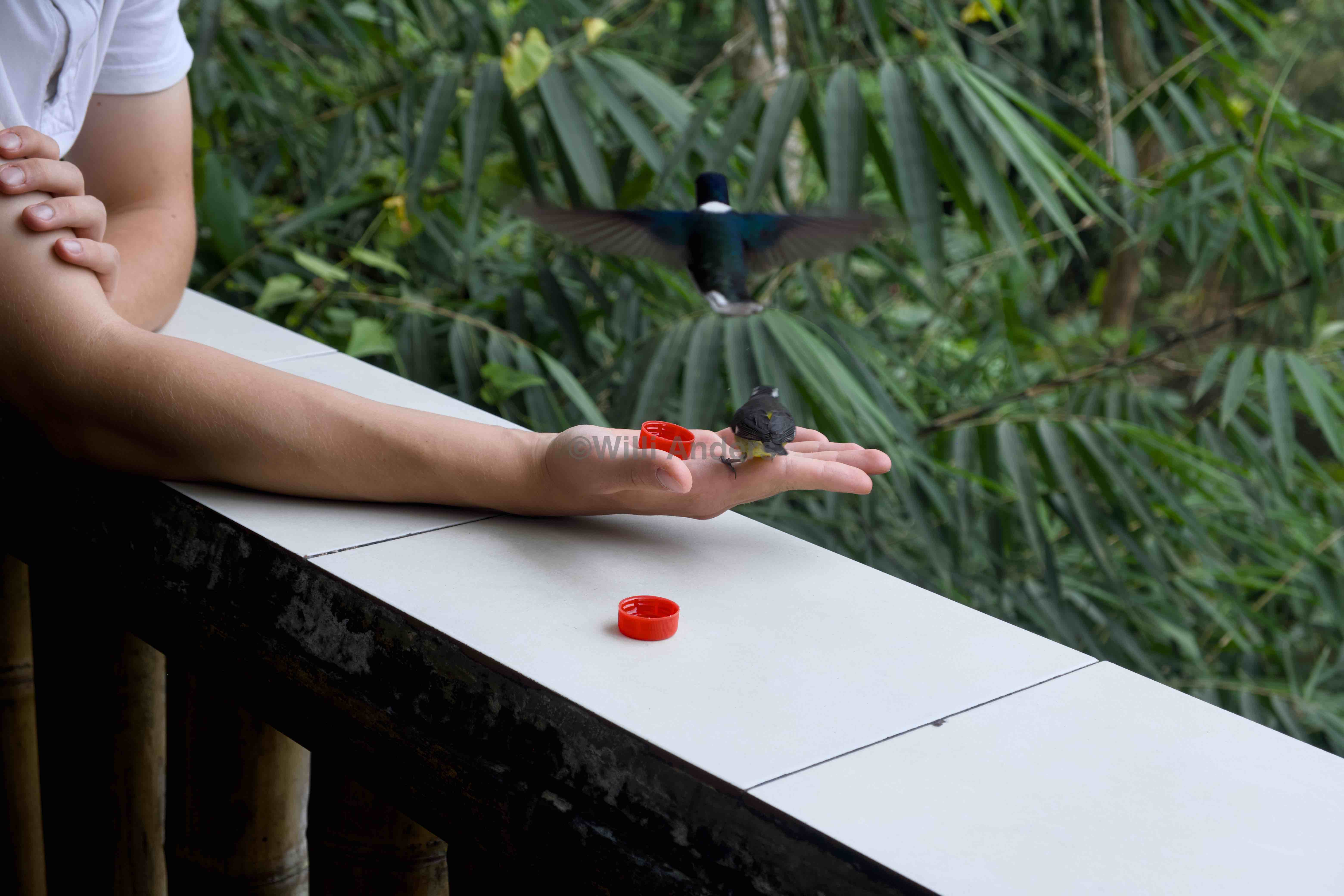 Diese kleine Kolibrierfahrung war uns aber noch nicht genug, weswegen wir uns anschließend auf zum Café Kolibri gemacht haben, das ebenfalls nicht weit entfernt liegt eine Viertelstunde Fußweg und schon ist man dort. Und was soll ich sagen: es war toll! Diese Kolibristation ist quasi DER Ort, um Kolibris von ganz nah zu sehen und auch zu spüren. Man bekommt dort nämlich kleine Flaschendeckel mit Zuckerwasser gefüllt, die man entweder vor sich auf das Geländer des Balkons oder auf seine eigene Hand legen kann um damit Kolibris anzulocken. Und das hat auch ziemlich gut funktioniert. Gefühlt ohne Ende sind diese Vögel auf meiner Hand gelandet, neben den ganzen Bienen und dem ein oder anderen Spatz-ähnlichen Vögelchen, die sich dazwischengeschoben haben. Das ist ein wirklich lustiges Gefühl, wenn sich diese kleinen Füßchen da auf die eigene Hand setzen. Irgendwas zwischen kitzelnd und sehr zart. Und es sitzt halt einfach ein Kolibri auf der Hand! Ich meine, ich habe zwar bereits welche in Archidona und Tena sehen können aber hier nochmal von ganz nah, das war schon echt cool. Und wenn ich schon beim Thema bin: nennt man Kolibrigeschwister eigentlich Kolibros?
